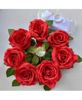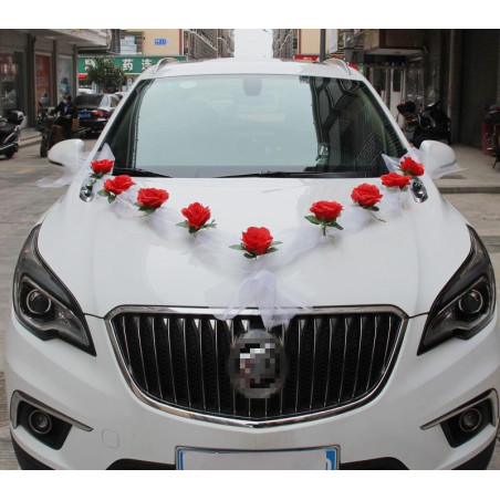 Set mit 9 roten Rosen und 2 roten Seidenstreifen. Nach der Hochzeitsfeier oder der Trauung verschwindet das Brautpaar in die Flitterwochen. Dazu gehört dieser schöne Autoschmuck! Bringen Sie die Blumendekoration mit den mitgelieferten Utensilien an Ihr Hochzeitsauto. Es wird dank schonender Anbringung mit Saugnäpfen nicht beschädigt. Machen Sie Ihren Auftritt speziell dank diesem hübschen Blumenschmuck.